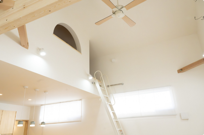 リビングの棚を組んでもらったところは、大変気に入っています。勾配天井、ロフトもかわいいです。
